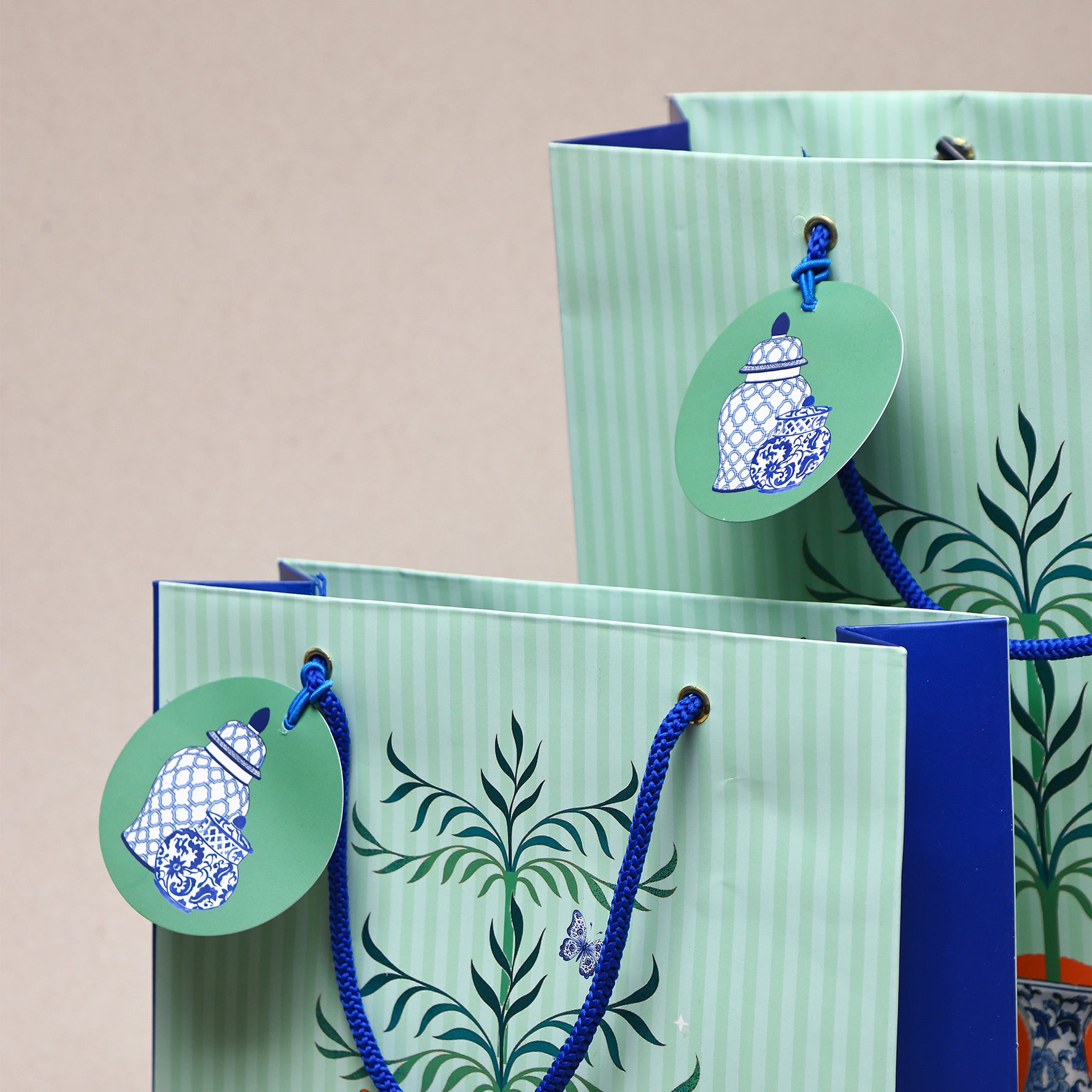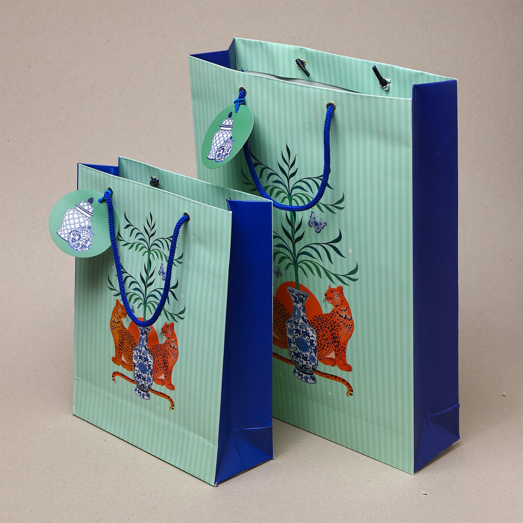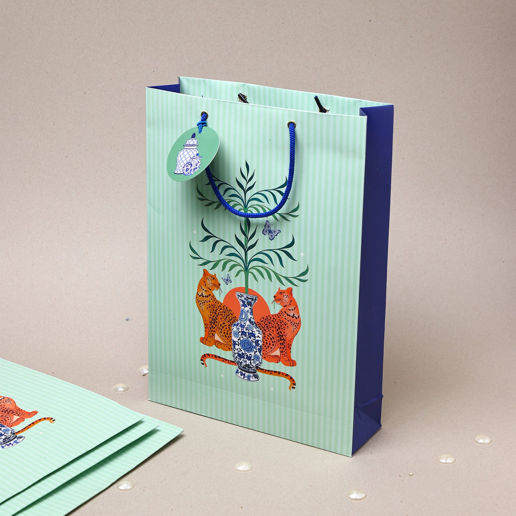 These gift bags bring palace drama to your everyday gestures — bold, composed, and full of character. With two proud cheetahs flanking a blue chinoiserie urn and surrounded by exotic palms, each bag tells a tale of glamour and mischief. Whether you’re delivering a keepsake or a quick pick-me-up, these bags turn simple gifts into artful gestures.