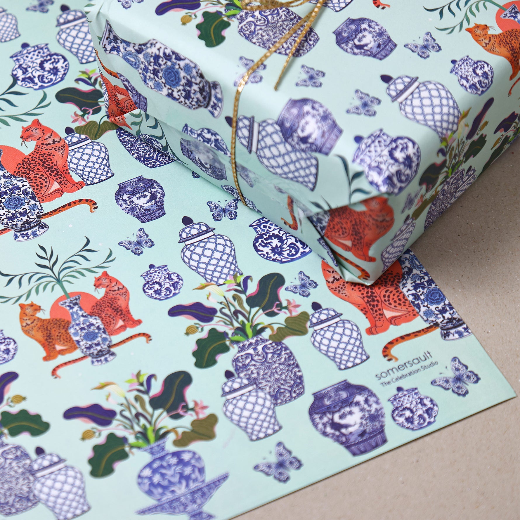 This is where gifting meets grandeur. With a print that feels lifted from painted halls and heirloom dreams, Cheetah Chutzpah wrapping paper is anything but ordinary. It’s a vibrant tapestry of hand-illustrated motifs — cheetahs at ease, chinoiserie vases brimming with palms, and butterflies flitting through a dreamy mint background. Whether used for birthdays, weddings, or just-because gifting, it sets the tone for a moment that’s bold and beautiful.