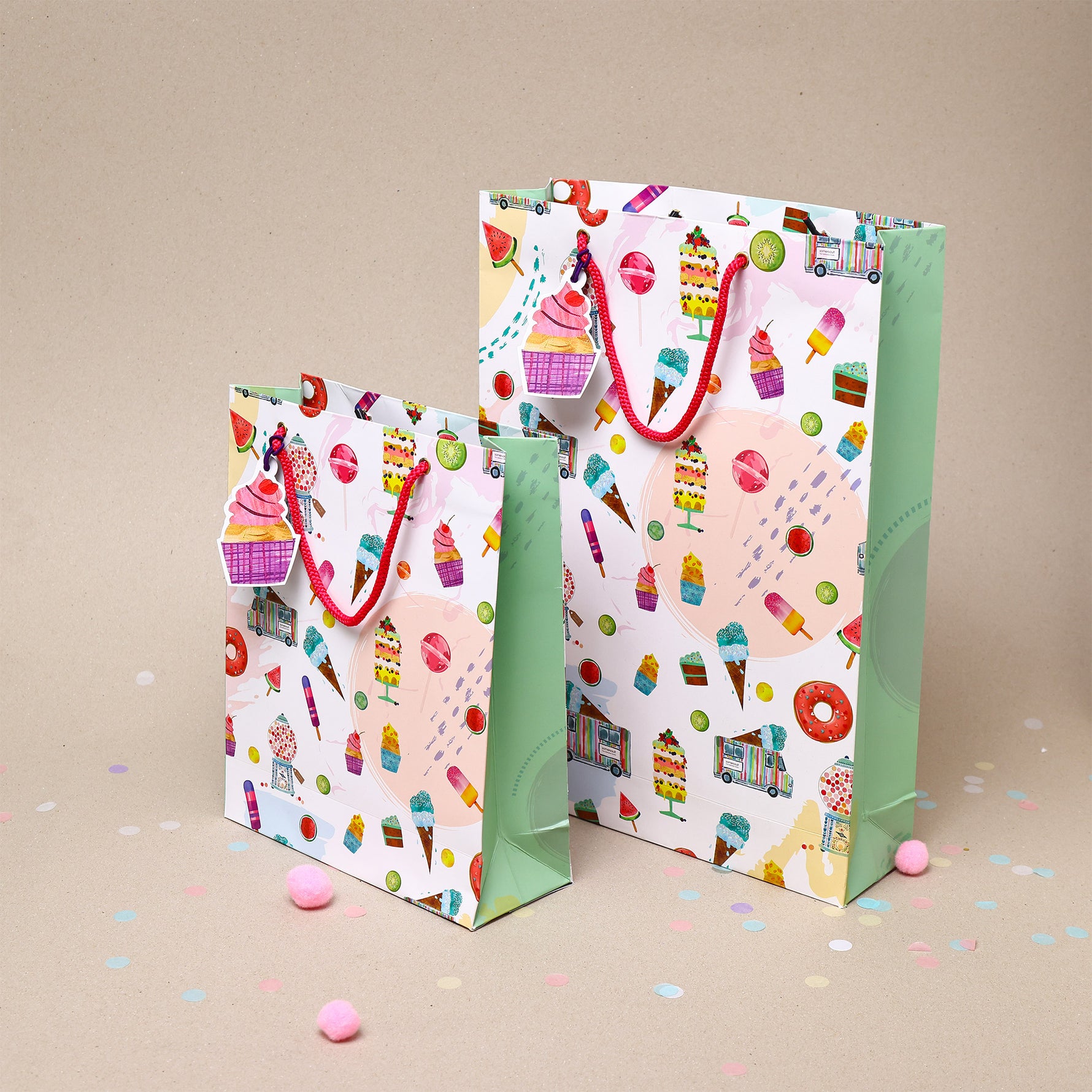 Illustrated with candy carts, popsicles, and playful pastries, these bags balance nostalgia with clean design. The glossy lamination enhances durability and gives the print a cheerful shine, while the sturdy rope handles make them easy to carry and hard to forget.