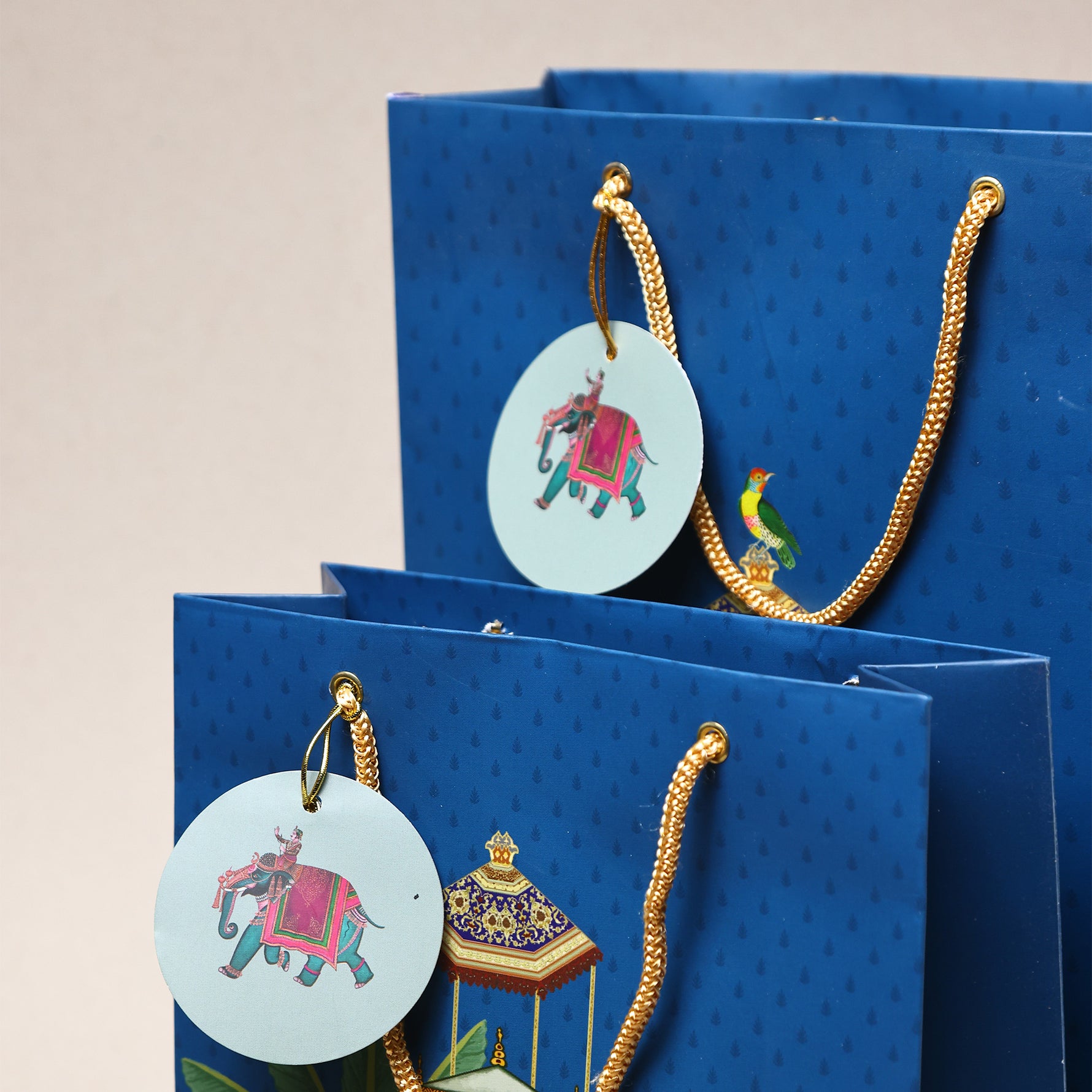 The composition brings together height, symmetry, and ceremonial motifs on a jewel-toned blue base. Gold rope handles add richness, while a glossy lamination brings out the depth of each illustrated detail — from chandeliers and parrots to the majesty of a marching elephant. It’s both sturdy and spectacular.