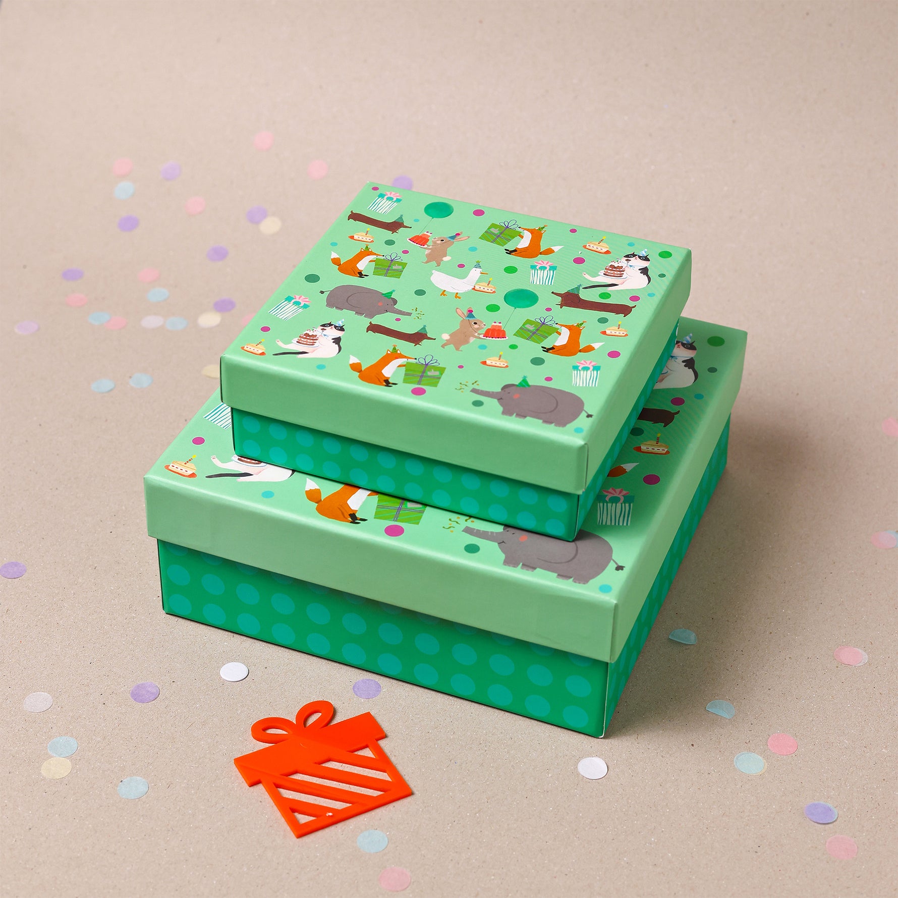 Each box tells a story of thoughtful celebration, where foxes cradle presents and elephants leap with joy. It's designed to bring that sense of delight that makes recipients pause and smile before they even discover what's inside.